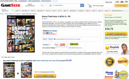Seperti yang kita ketahui, game GTA V yang telah memecahkan rekor sebagai game dengan penjualan tercepat sepanjang masa sampai saat ini baru hadir untuk konsol game saja dan belum tersedia untuk paltform PC Windows.Retail online GameSeek telah menampilkan cover art GTA V untuk PC yang menyebutkan bahwa game GTA V untuk PC akan hadir di Inggris pada 22 November 2013. GameSeek sendiri saat ini telah membuka pre-order game GTA V untuk PC yang banyak ditunggu-tunggu kehadirannya.